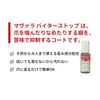 「マヴァラ バイターストップ 10ml」は、爪を噛んだりなめたりする癖を、苦味で抑制するコートです。大人から子供までどなたでもご使用できる苦味成分で、お口の中に特殊な味が広がります。トップコートが乾いた後にご使用ください。爪に直接塗ってもご使用いただけます。効果を継続したい時は毎日重ね塗りをしてください。