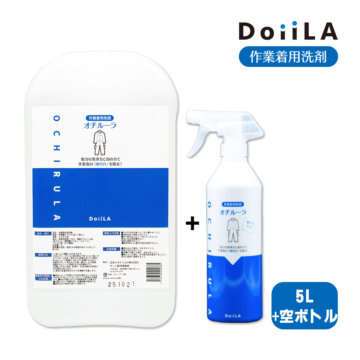 [ 作業着用洗剤 ]オチルーラ 作業着用 5L+空ボトルつきご好評いただいている「オチルーラ 作業着用」から、**たっぷり使える業務用サイズ(5L)**が登場しました!これまでの使いやすさ・強力な洗浄力はそのままに、「毎日使う」「まとめて洗う」「現場でシェアしたい」方におすすめの大容量タイプです。たっぷり使いたい方や、家族・職場でまとめて洗う方におすすめ!【特長】■ 中身は同じ、油汚れ専用処方機械油・エンジンオイル・防錆油・食用油など、現場の油汚れを強力分解。独自配合の界面活性剤とアルカリ成分で、繊維に染み込んだ油をしっかり落とします。■ 詰替え・共有運用に便利スプレーボトルに移し替えて使えるので、個人でも職場でも使いやすい!たっぷり使えるから、頻繁に洗う方にも安心です。[ 使用方法 ](1) いつものお洗濯前に衣類の油汚れの気になる部分にスプレーして(2) 10分待って(3) 通常通りお洗濯。※場合によっては、生地を傷める可能性があります。目立たないところで一度お試しください。