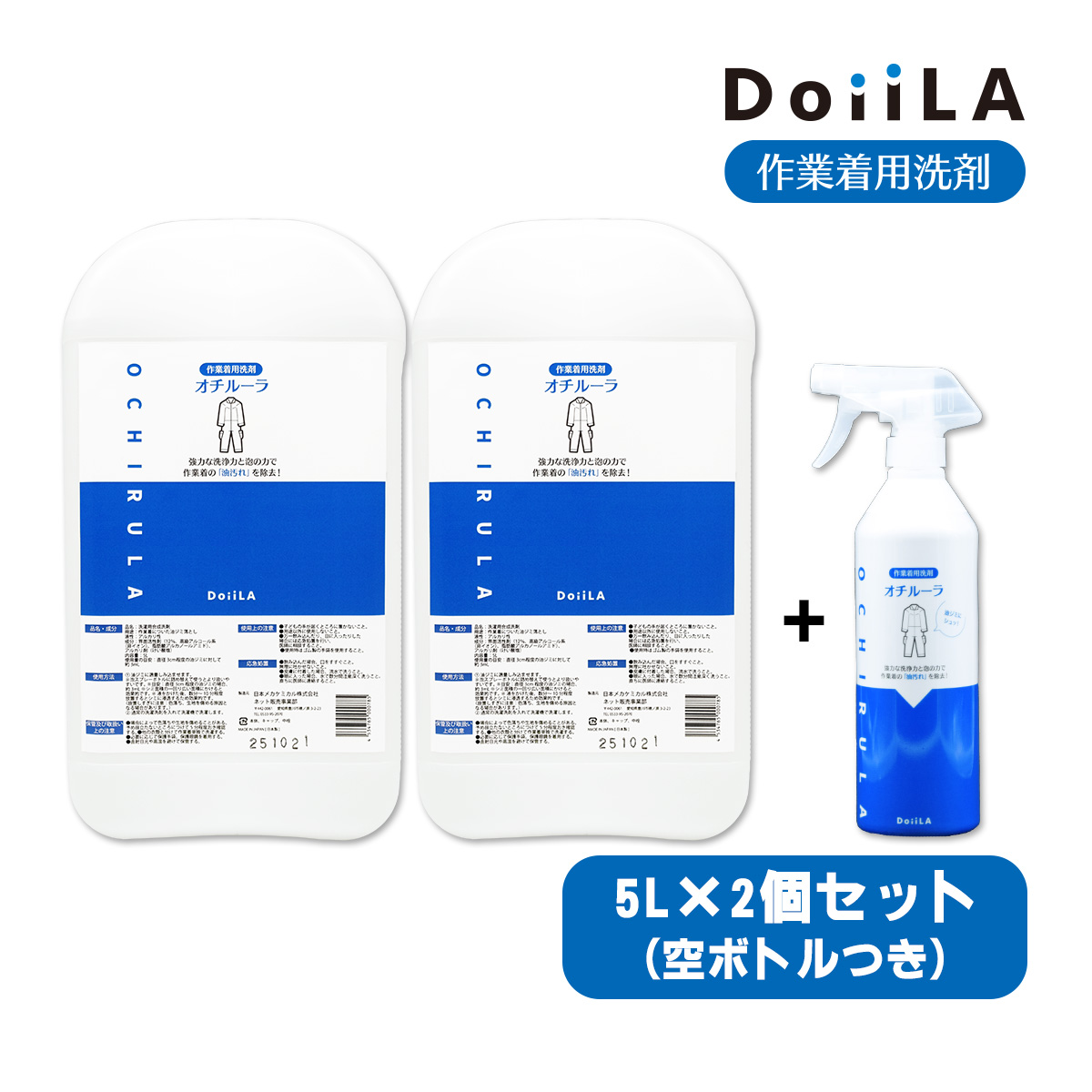 [ 作業着用洗剤 ]オチルーラ 作業着用 5L×2個セット+空ボトルつきご好評いただいている「オチルーラ 作業着用」から、**たっぷり使える業務用サイズ(5L×2個セット+空ボトルつき)**が登場しました!これまでの使いやすさ・強力な洗浄力はそのままに、「毎日使う」「まとめて洗う」「現場でシェアしたい」方におすすめの大容量タイプです。たっぷり使いたい方や、家族・職場でまとめて洗う方におすすめ!【特長】■ 中身は同じ、油汚れ専用処方機械油・エンジンオイル・防錆油・食用油など、現場の油汚れを強力分解。独自配合の界面活性剤とアルカリ成分で、繊維に染み込んだ油をしっかり落とします。■ 詰替え・共有運用に便利スプレーボトルに移し替えて使えるので、個人でも職場でも使いやすい!たっぷり使えるから、頻繁に洗う方にも安心です。[ 使用方法 ](1) いつものお洗濯前に衣類の油汚れの気になる部分にスプレーして(2) 10分待って(3) 通常通りお洗濯。※場合によっては、生地を傷める可能性があります。目立たないところで一度お試しください。