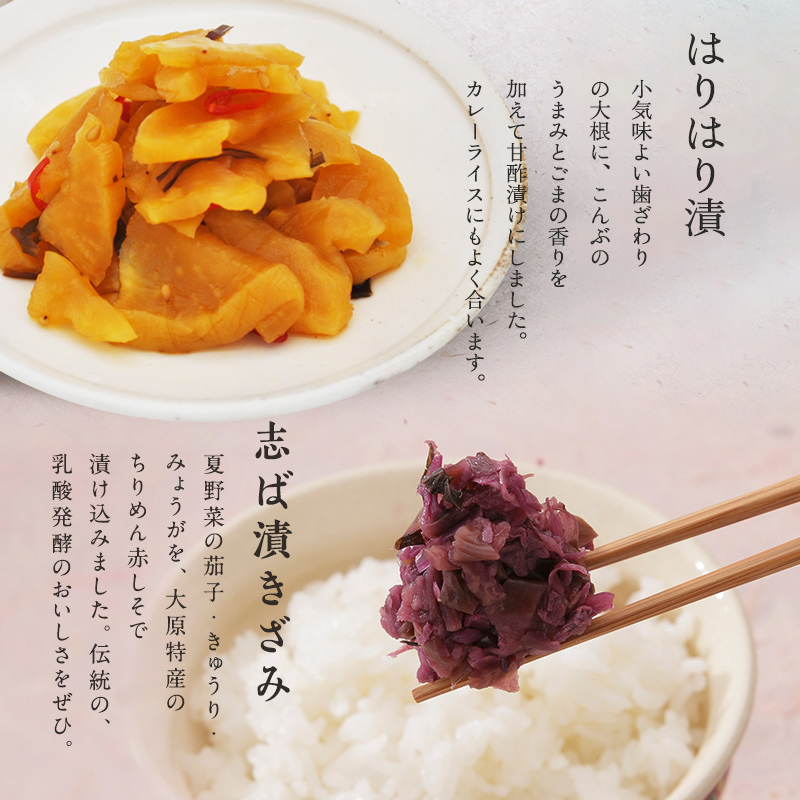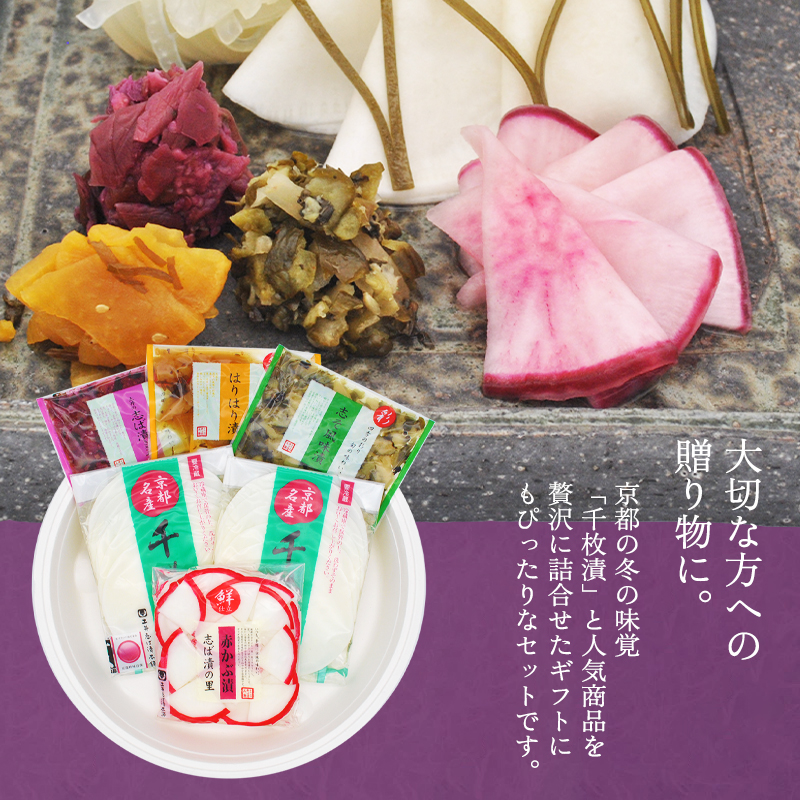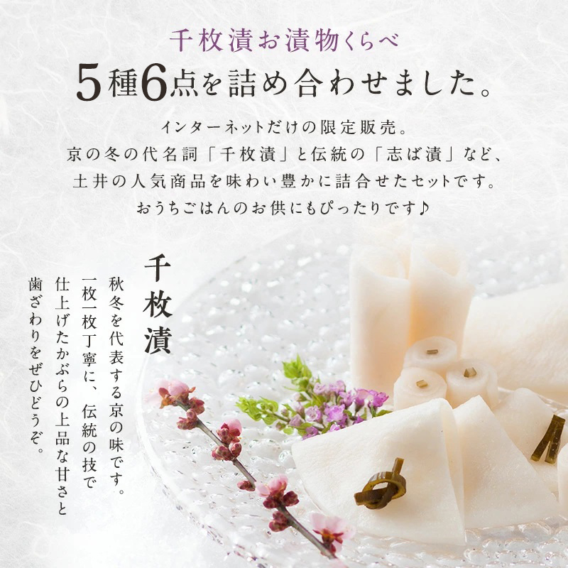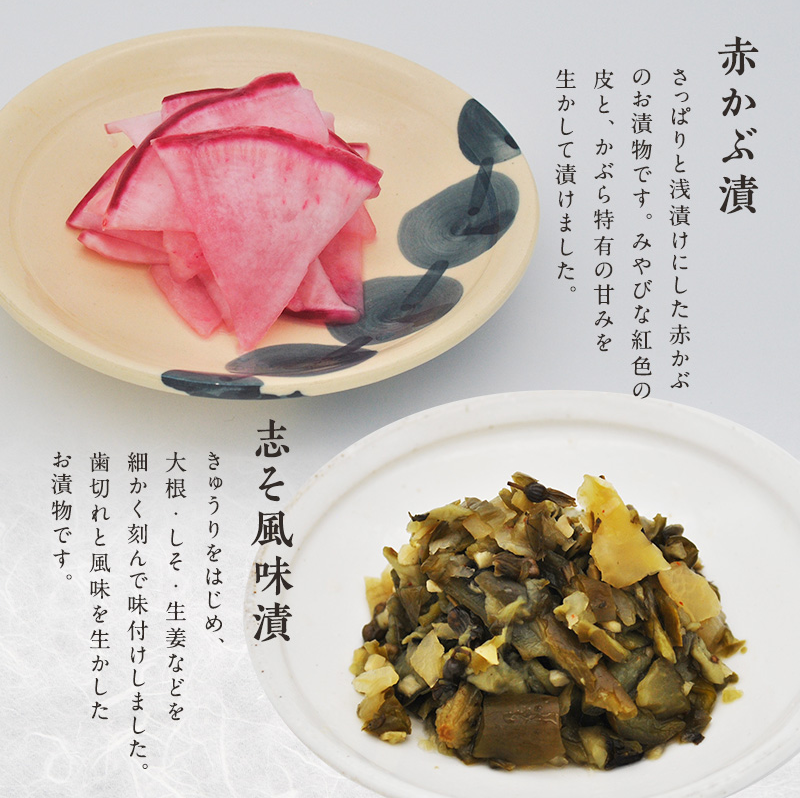 | 内容数(5種6点入) | 千枚漬(80g)×2・赤かぶ漬(72g)・志ば漬きざみ・志そ風味漬・はりはり漬(各40g) ※原材料の一部に大豆及び小麦を含みます。 |