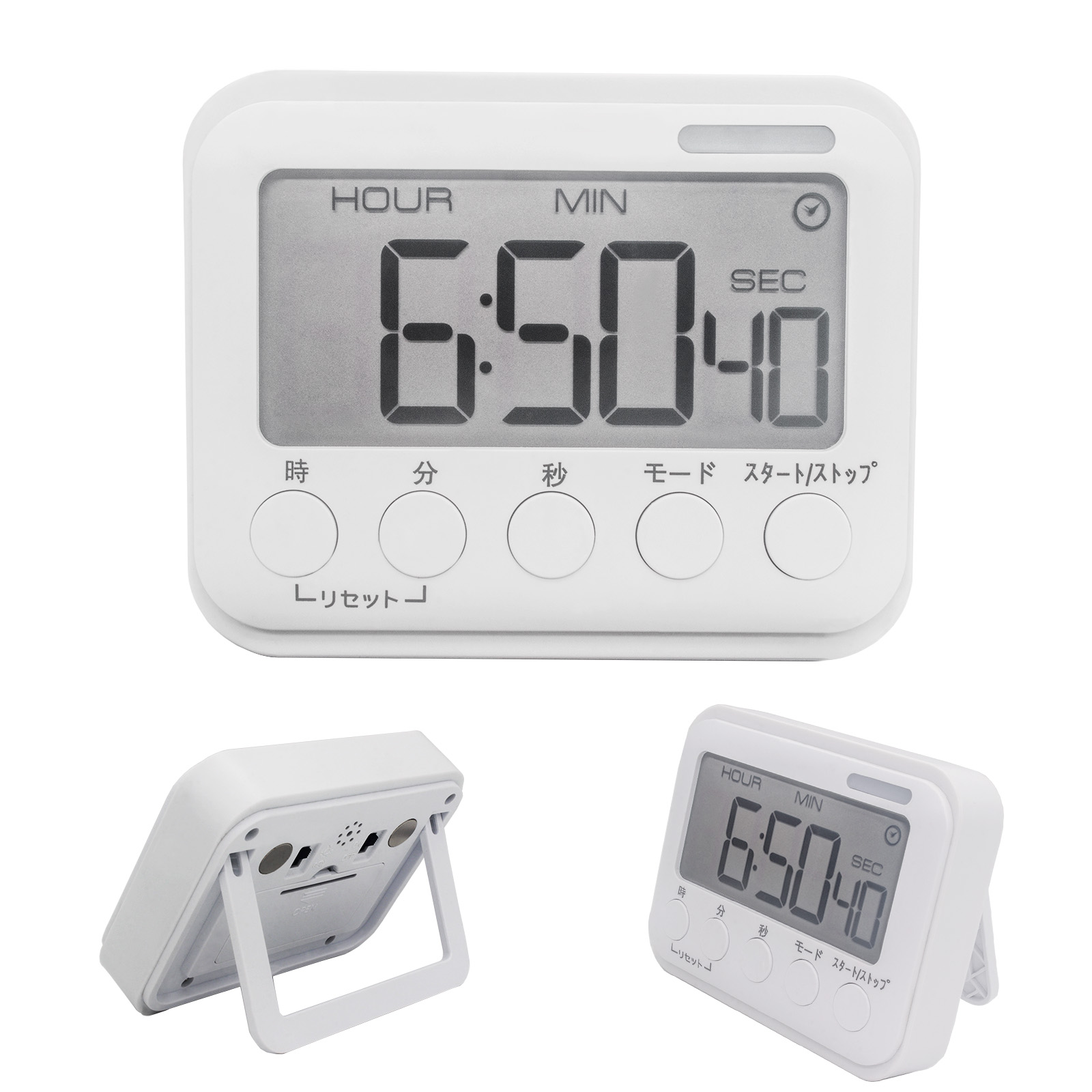 (1)音光切替可・消音モード付き、タイマーは背面に音とフラッシュの切り替えスイッチがあり、音が必要なときは70db以上の大きなアラームを鳴らし、音が必要ないときはフラッシュモードに切り替えることができるので、図書館や深夜など、周囲に迷惑をかけないようにすることができます。