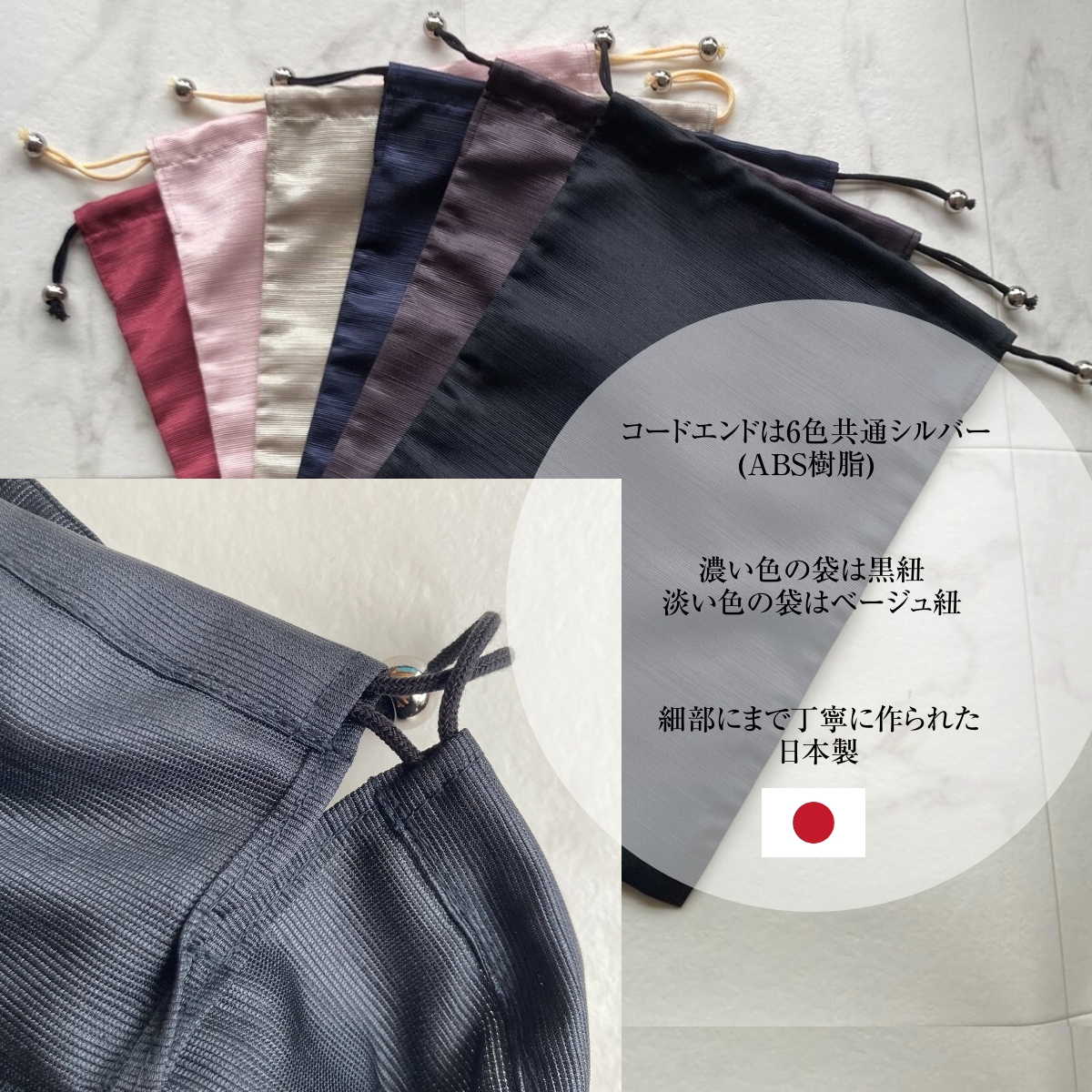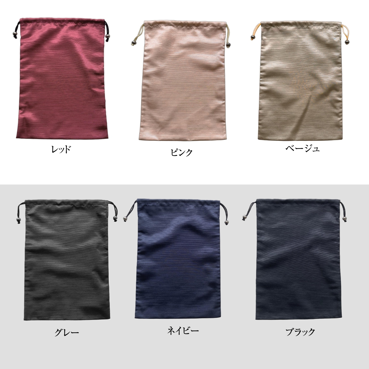 ※ピンクとベージュの色にはベージュ色の紐を、他の濃い色は黒の紐となります。
