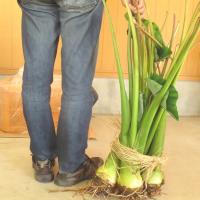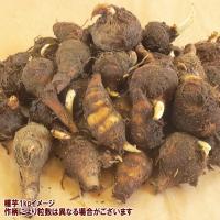 親芋も子芋も茎も食べられる青茎里いもの種芋です。地元ではズイキ芋やからどり芋ともよばれ、サトイモ科の中でも葉柄が穫れるので人気の品種です。地元では茎は茹でて和え物にしたり、天日で乾燥させて「からとり」の名前で親しまれており、干しずいきとなったものは汁の実に利用可能です。地元の郷土料理にかかせない保存食品となります。