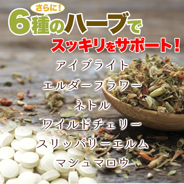 | 原材料名 | ぶどう糖(国内製造)、水溶性植物繊維、ジャバラエキス、マヌカハニー、アイブライト、エルダーフラワー、ネトル、スリッパリーエルム、マシュマロウ、ワイルドチェリー/セルロース、ショ糖脂肪酸エステル、クエン酸、香料、微粒二酸化ケイ素、甘味料(スクラロース) |