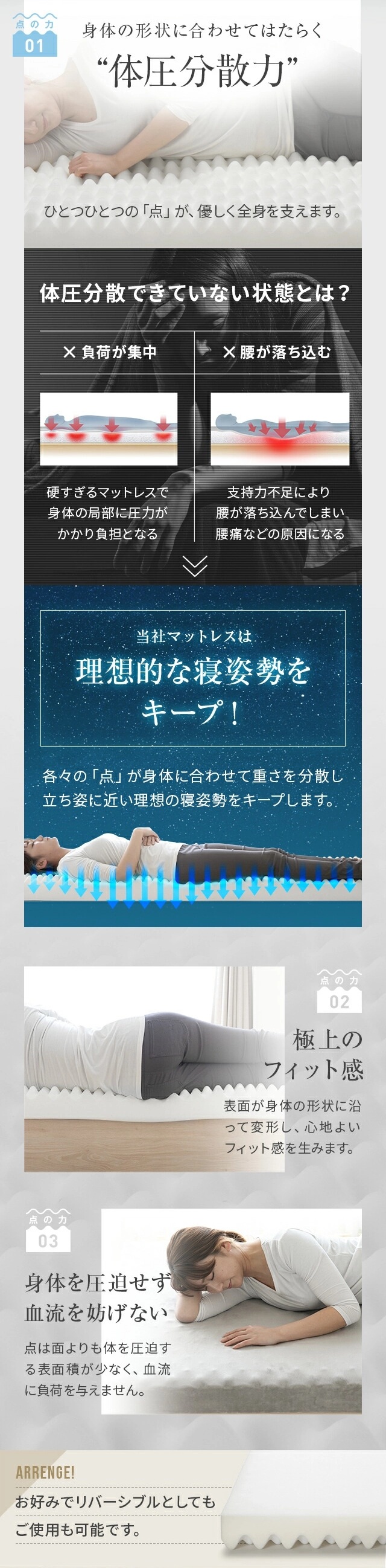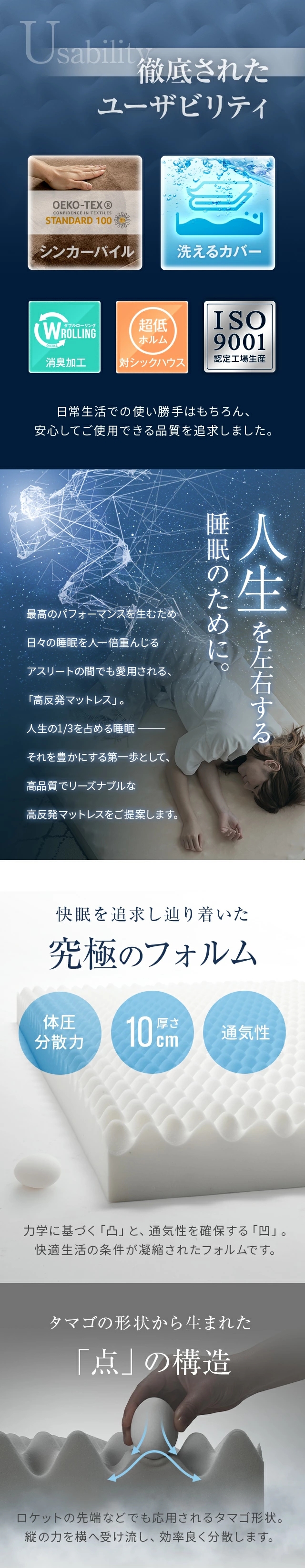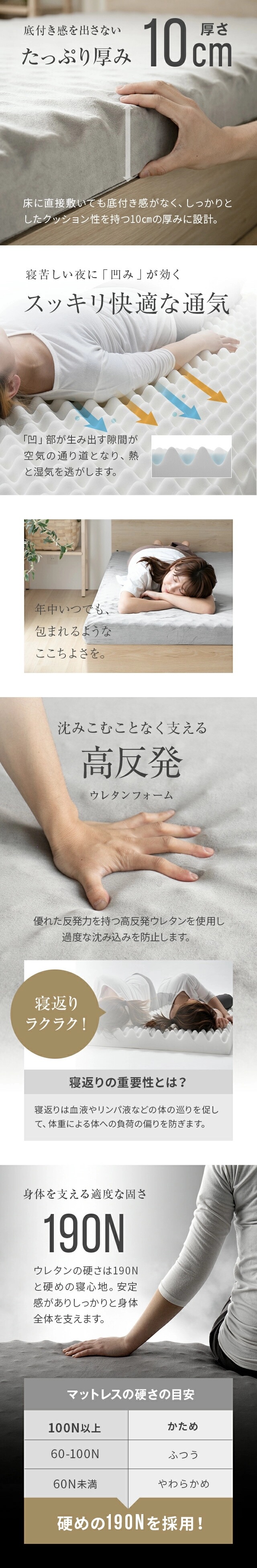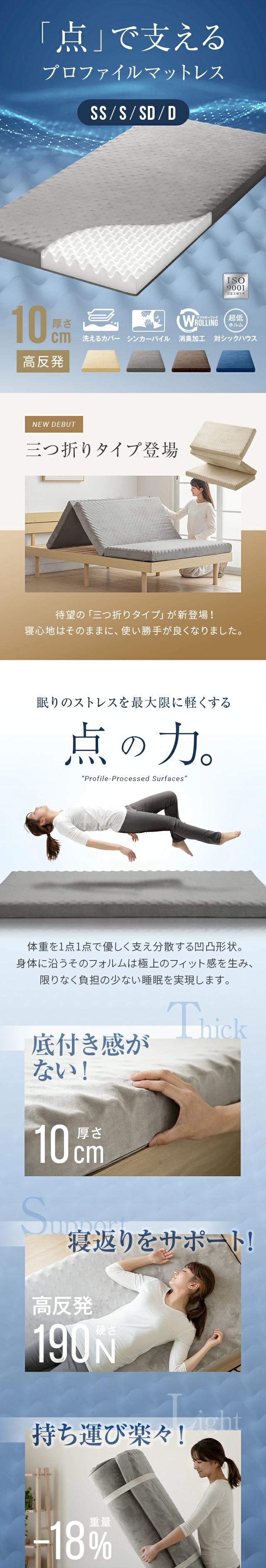 マットレス セミシングル 高反発 極厚10cm 三つ折り プロファイル 体圧分散 寝具 高反発マットレス 洗える 190N