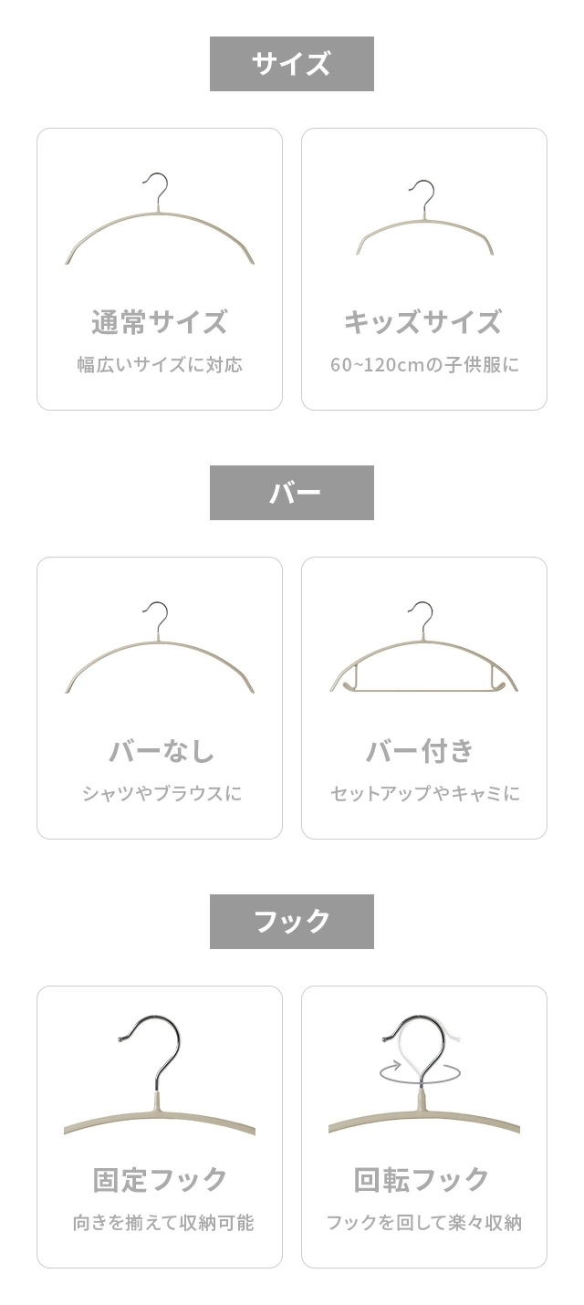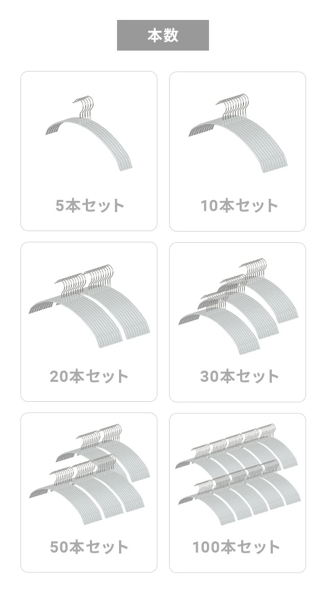 お持ちの不揃い・経年劣化したハンガーを一度に入れ替えできる5/10/20/30/50/100本セット。見栄えも統一感がでて綺麗に整います。
