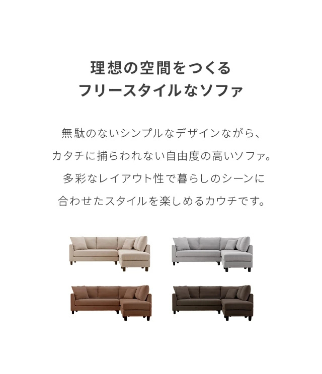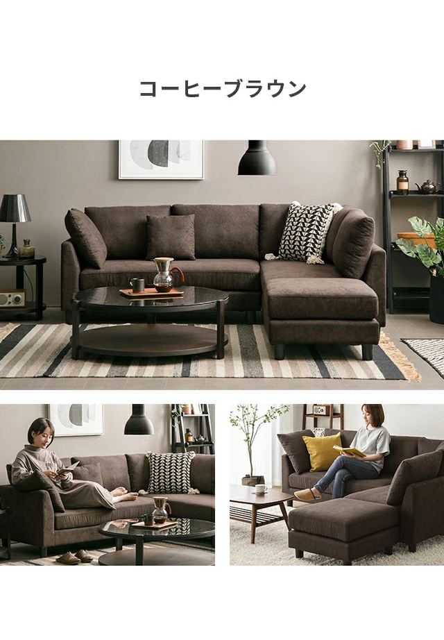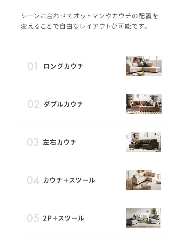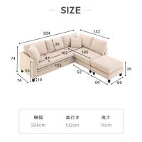 サイズ:2Pソファ…約 幅144×奥行き74×高さ74(座面高39)cm / カウチソファ…約 幅72×奥行き132×高さ74(座面高39)cm / オットマン…約 幅60×奥行き60×高さ39cm