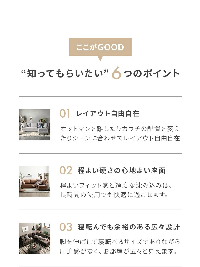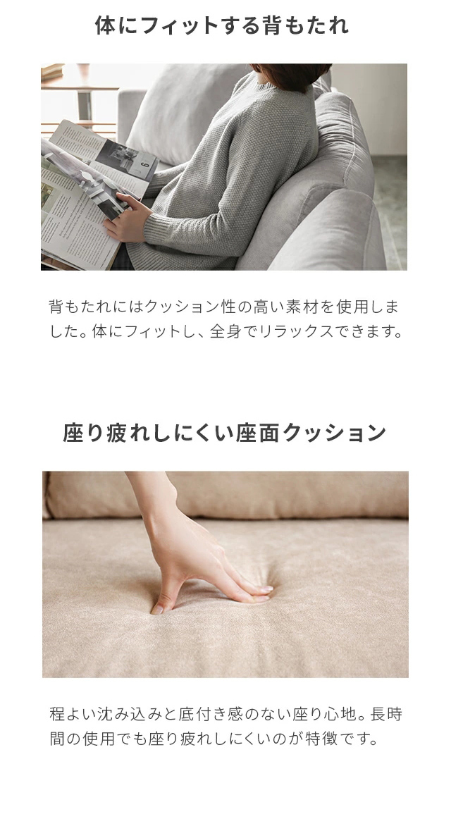 おすすめポイント:レイアウト自由自在、程よい硬さの心地よい座面、寝転んでも余裕のある広々設計