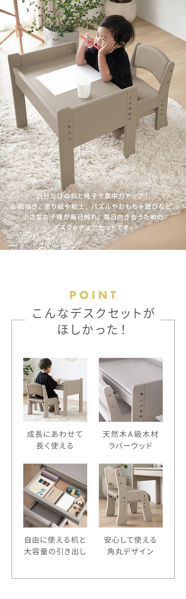 おすすめポイント:成長に合わせたサイズ調整、安心の耐久性、けが防止の角丸デザイン