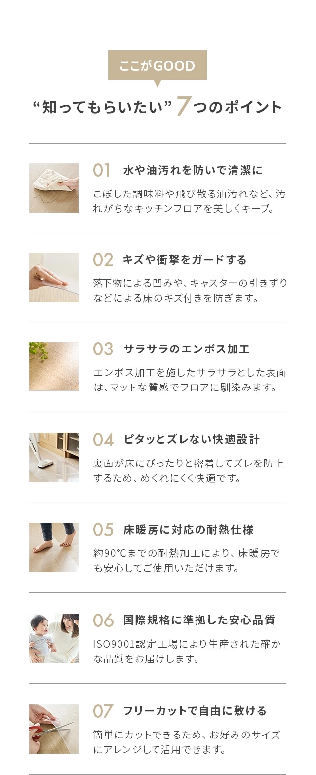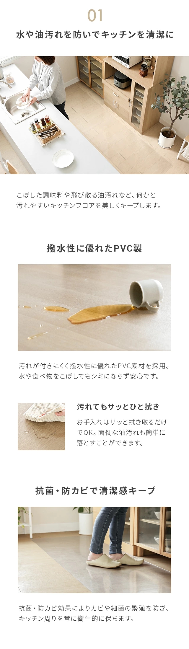 キッチンマット 透明 240cm 270cm 拭ける PVC クリア 120cm 150cm 180cm 幅 45cm 60cm 80cm 100cm 厚さ1.5mm 撥水 抗菌 防カビ 耐熱 床暖房対応 透明マット 床保護マット 保護シート 滑り止め 滑らない カット可 キッチン 台所 おしゃれ 爆買