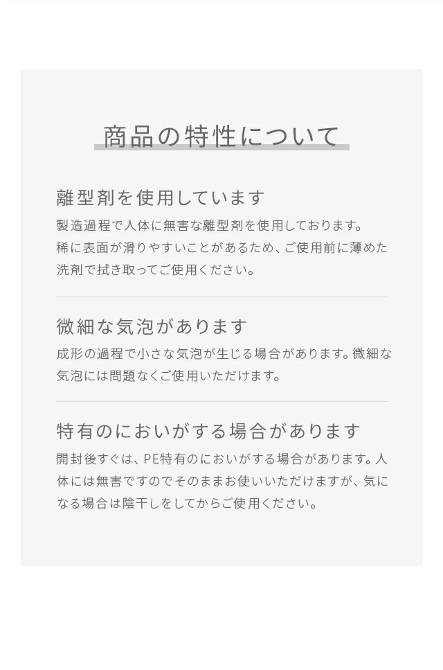 ・製造時に型から外しやすくする剥離剤が塗布されているため、開封後すぐは滑りやすい場合がございます