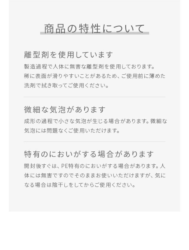 ・製造時に型から外しやすくする剥離剤が塗布されているため、開封後すぐは滑りやすい場合がございます