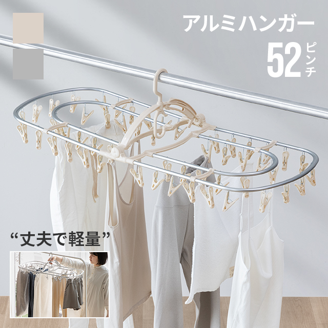 洗濯物をまとめて干せる、軽量なアルミ製角ハンガー。二重配列のピンチで下着などの隠し干しができるほか、かもいフック付きで室内干しにも対応します。上質な印象のアルミフレームと穏やかな色合いは暮らしに馴染みやすく使う人にも優しいデザインです。