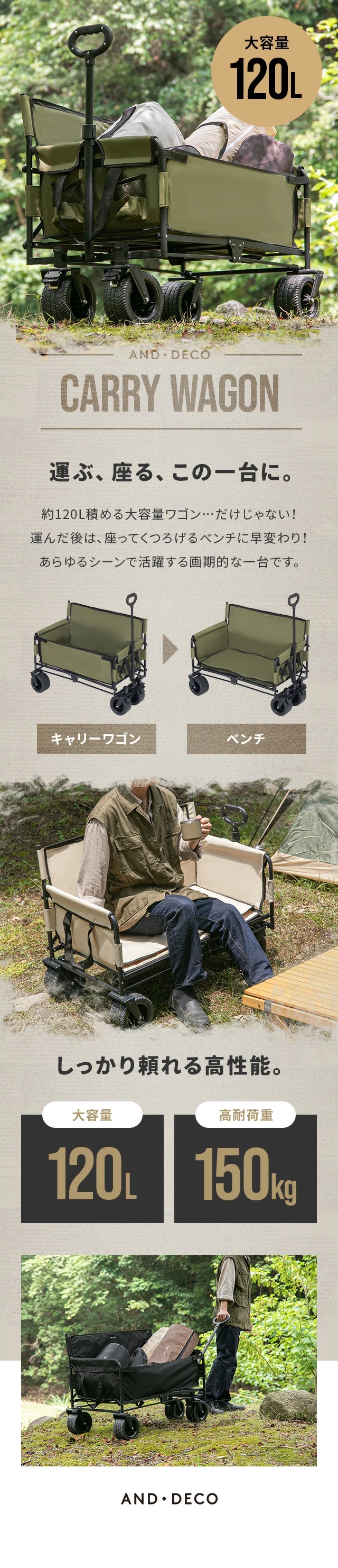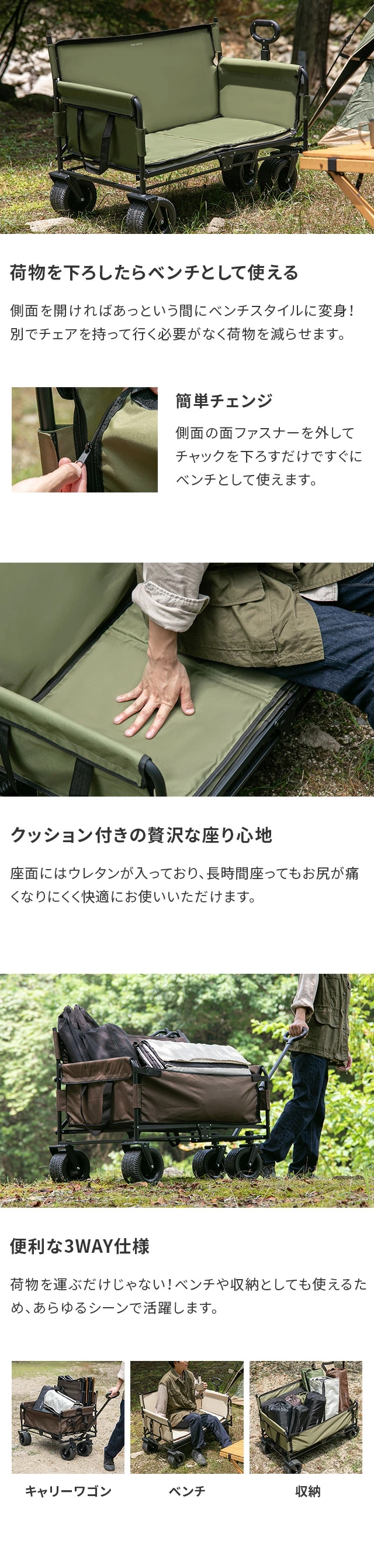 キャリーワゴン 大容量 ベンチワゴン アウトドアワゴン 3way 耐荷重150kg 折り畳み キャリーカート カート キャンプ レジャー アウトドア
