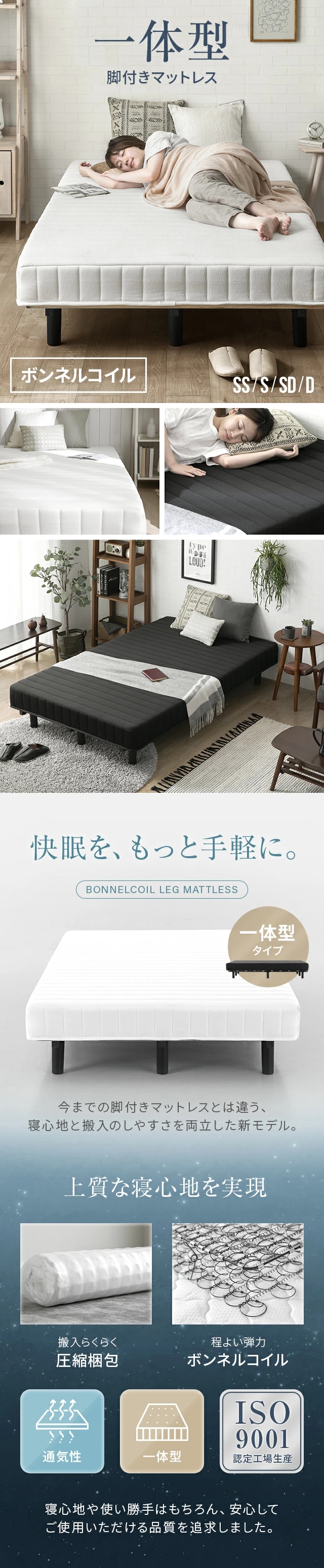検索キーワード:ベッド おしゃれ 脚付きマットレス シングル シングルベッド ロール 脚付きマットレスベッド すのこ 圧縮梱包 一体型 ボンネルコイル モダンデコ 爆買