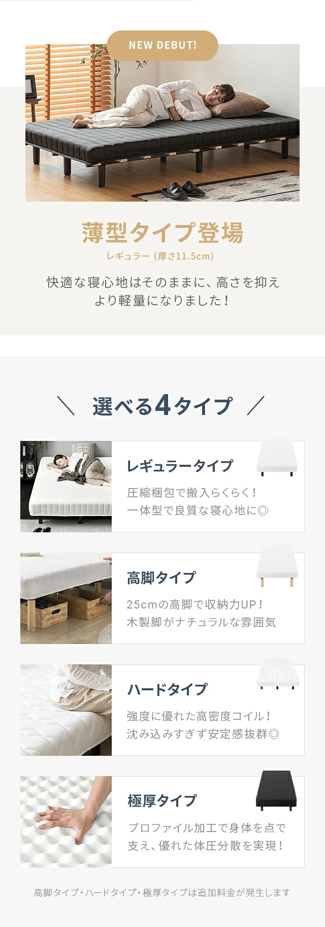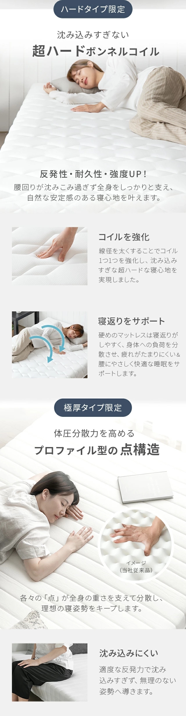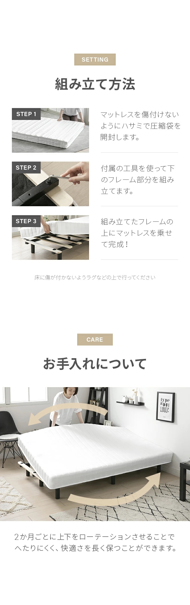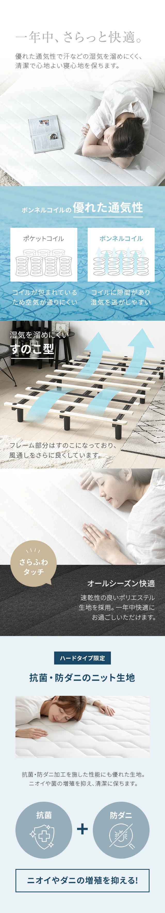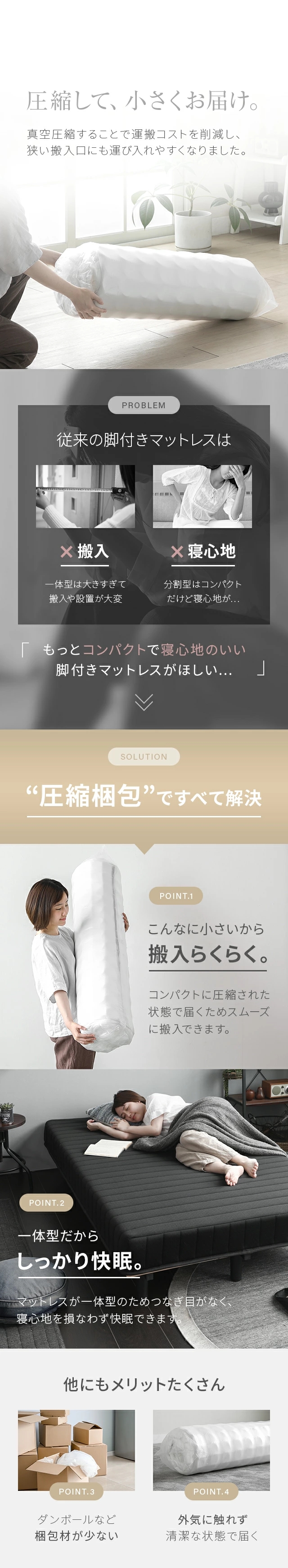 おすすめポイント:圧縮梱包し配送、マットレス一体型、ほどよい弾力のボンネルコイル