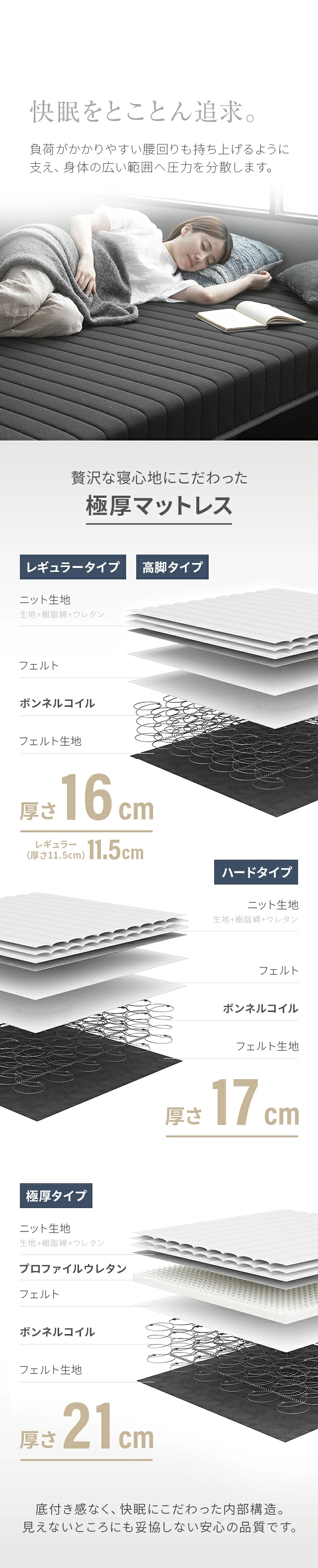 材質:生地+樹脂綿+10mm、D18ウレタン+不織布、圧縮ポリフェルト、ボンネルコイル(4巻き、線径2.2mm)、樹脂脚(PP)