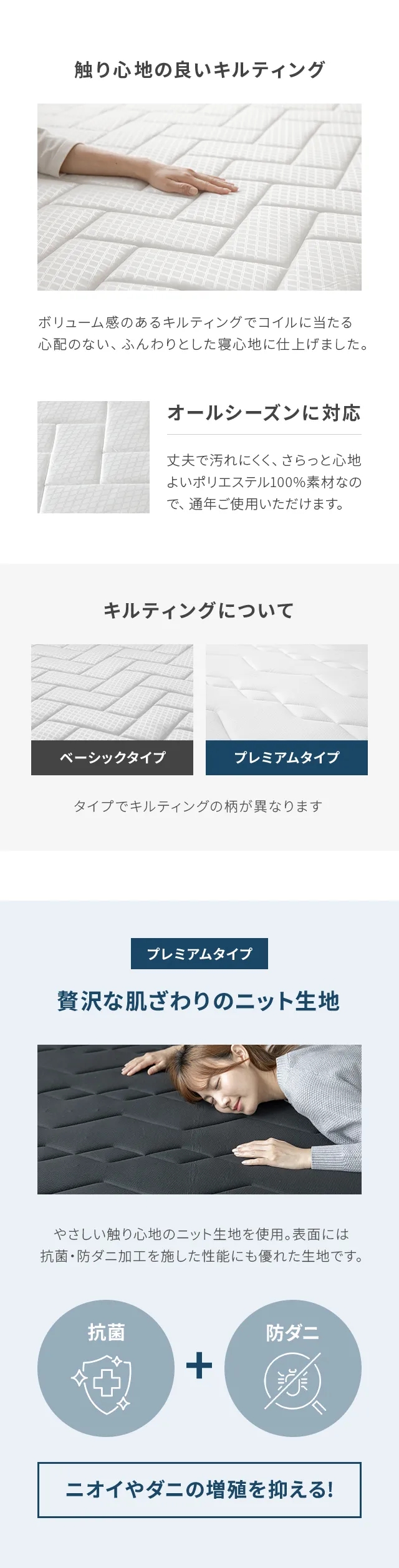 材質:外装生地…ポリエステル100%、本体…ポケットコイルスプリング、コイル数…465個、詰め物…ウレタンフォーム・フェルト