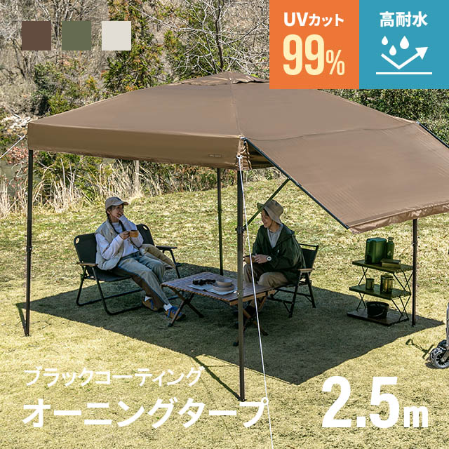 タープテント 2.5m オーニング オーニングタイプ ブラックコーティング ワンタッチ 軽量 日よけ UVカット ソロキャンプ 3ヵ月保証