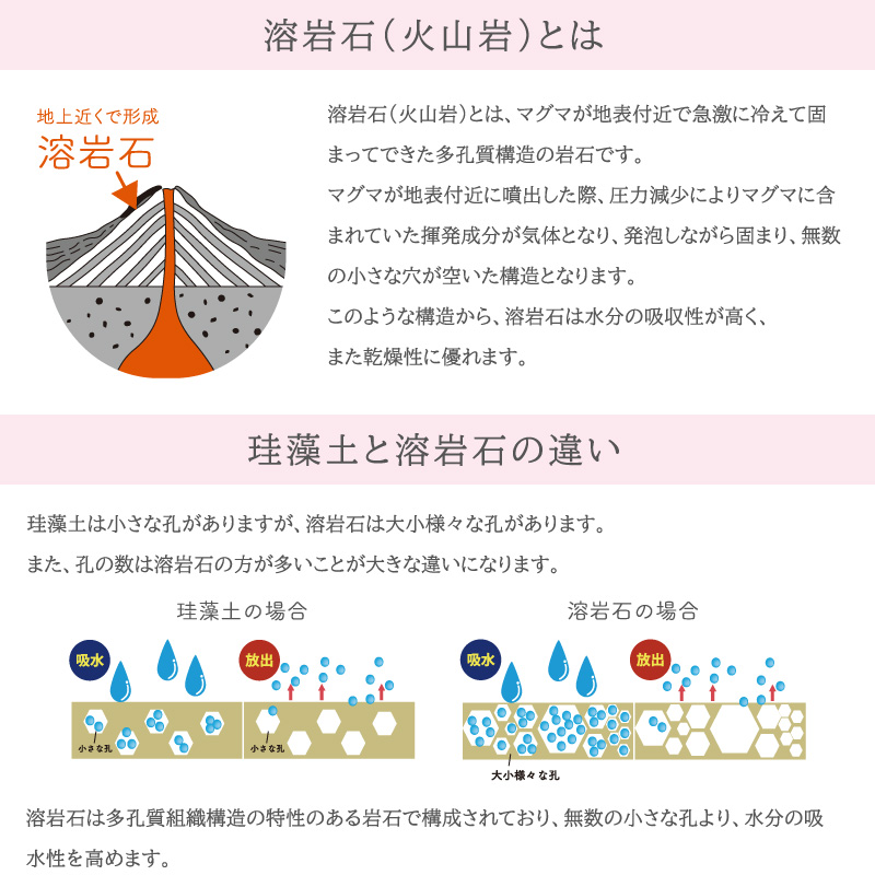 マグマが地表付近で急激に冷えて固まってできた多孔質構造の岩石です。無数の小さな穴が空いた構造から、溶岩石は水分の吸収性が高く、また乾燥性に優れます。