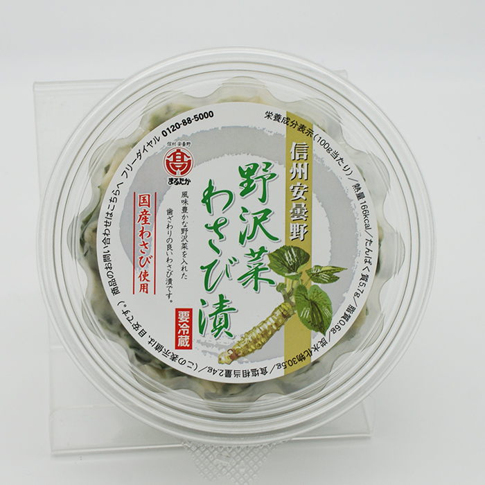 国産わさび使用、風味豊かな野沢菜を入れた歯ざわりの良いわさび漬けです