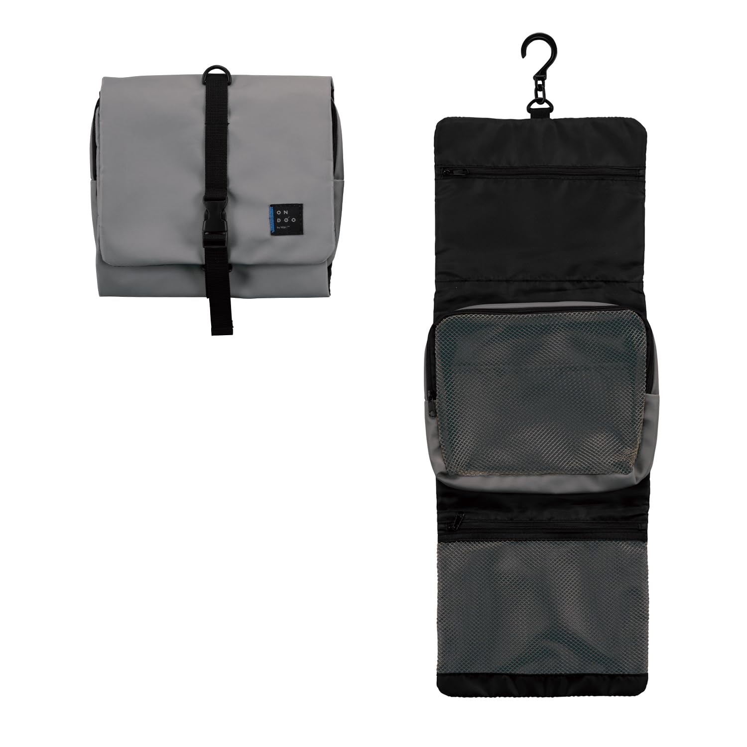 トラベルセットをまとめて収納できる、フック付きポーチ。
