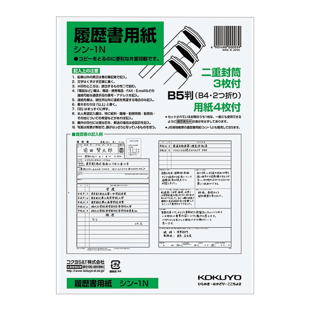 KOKUYO コクヨ 履歴書用紙 ワンタッチ封筒付 B5 B4 2つ折り 4枚 小型二重封筒3枚 シン-1N