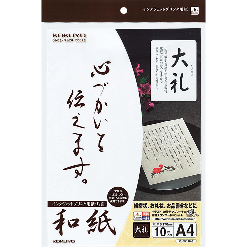 コクヨが手掛ける高品質なインクジェット対応和紙、大礼柄です。公式行事の挨拶状や、結婚式の案内状、飲食店のお品書き、特別な日のPOPなど、幅広いシーンで上品な演出を可能にします。伝統的な「大礼柄」が、格式と華やかさを添え、受け取る人の心に深い印象を与えます。インクがにじみにくく、顔料・染料インクどちらにも対応しており、美しい印刷品質を実現。さらに、筆やペンでの手書きも可能で、メッセージに温かみを加えることができます。無料テンプレートサービスもご活用いただけ、デザインの幅が広がります。A4サイズ10枚入り、紙厚95g/m2(0.17mm)。