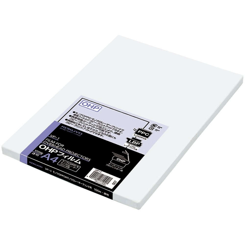 OHPフィルム PPC用 100枚入 複数枚の印刷にも活躍 OHPフィルムの表面に特殊加工が施されており、PPC(静電複写機)で連続コピーができる仕様になっています。そのため、1枚ずつ印刷にかけるといった手間を省くことができ、印刷にかかる時間の短縮が望めます。特に、職場で大量に同じ内容を印刷する場合には、フィルムをよくさばいてからセッティングすることで連続コピーのミスを軽減できるので便利です。仕事の効率アップも期待できます。 ※用紙厚さ144g/m2に対応する機種でお使いください。 用途に合わせて選べる容量 こちらのOHPフィルムには、20枚入りと100枚入りの2種類があります。自宅用や少量使用したいときには20枚入りで無駄なく使っていただき、会社で大量に印刷するときや在庫を保管しておきたい場合には、100枚入りの大容量タイプをお使いいただくと便利です。 |