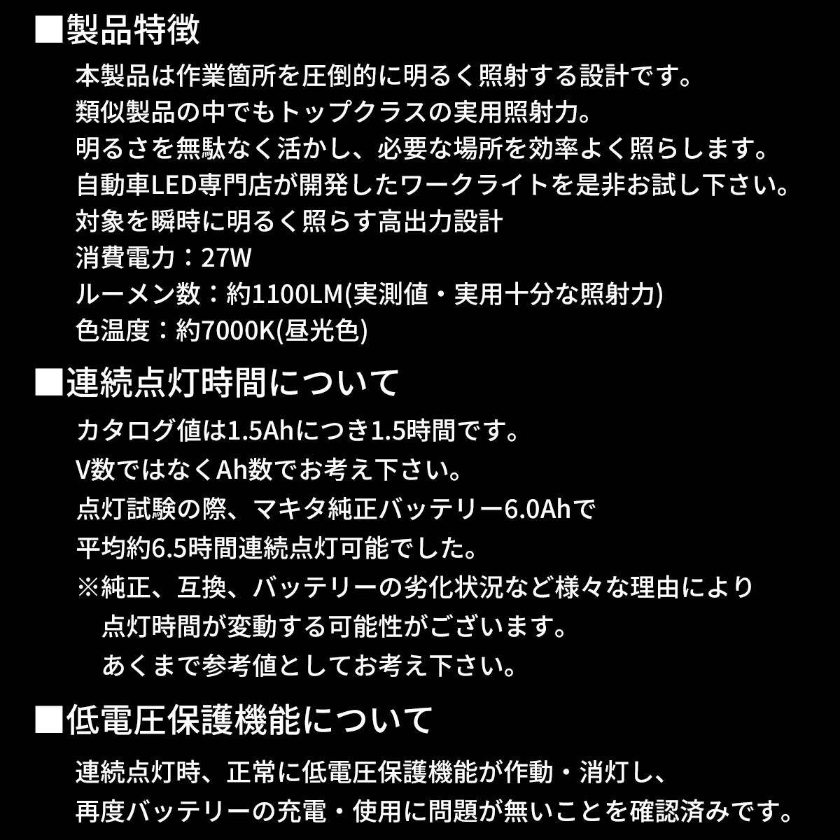 | 商品内容 | 初回入荷時、即完売した人気アイテムです。工事現場、DIY、屋外作業、夜釣り、キャンプ、登山、アウトドア、災害時など、幅広いシーンで活躍します。 マキタのバッテリーで使用可能なLEDワークライトです。 明るさ、耐久性、軽さにこだわった商品です。 スイッチ・配線を含めオールブラックのシンプルで無駄のないデザイン。 バッテリー残量が少なくなった際は、バッテリー保護のため自動で電源OFFになる低電圧保護機能を搭載しています。 IP66防水仕様。 ※明るさ・点灯時間を優先した設計のため、USB電源出力機能は搭載しておりません。 点灯試験の結果、マキタ純正バッテリー(6.0Ah)使用時で平均約6.5時間の連続点灯が可能でした。 カタログ値は1.5Ahあたり約1.5時間です。 ※純正、互換、使用状況、バッテリーの劣化状況などにより点灯時間は変動する場合がございます。あくまで参考値としてお考え下さい。 連続点灯中に低電圧保護機能が作動し消灯した場合でも、再充電後は通常通りご使用いただけることを確認済みです。 |