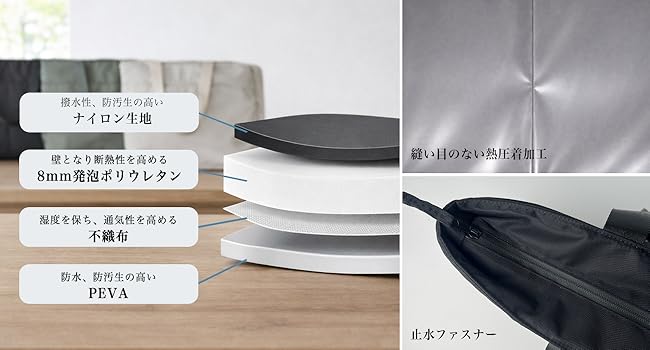 中材には断熱性の高い発泡ポリウレタンと不織布を使用し、湿度を保ちつつ外気の影響をしっかりと遮断。