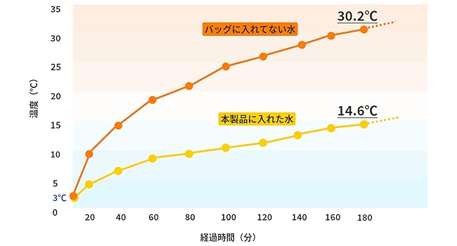 外部検査機関にて保冷力試験を実施真夏を想定した気温35℃の環境下で、3℃に冷やした水(2L)の温度変化を10分おきに記録。(氷や保冷剤は入れてない状態)