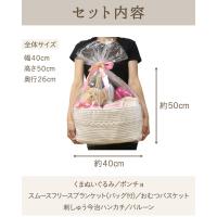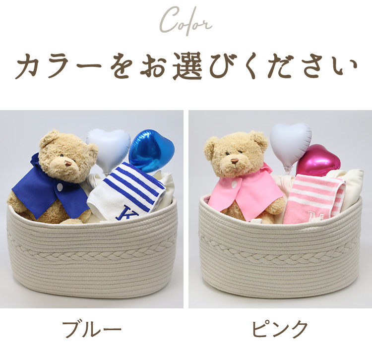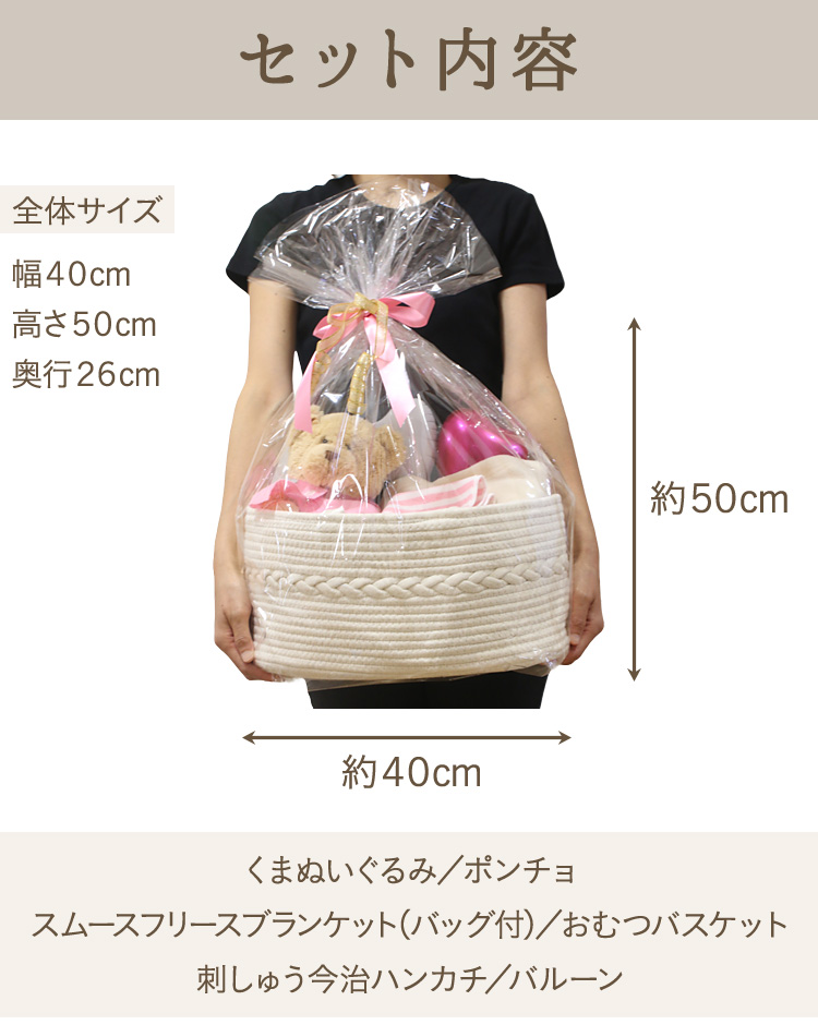 | くまぬいぐるみ、ポンチョ、スムースフリースブランケット(バック付)、おむつバスケット(おむつストッカー)、刺繍今治ハンカチ、バルーン |