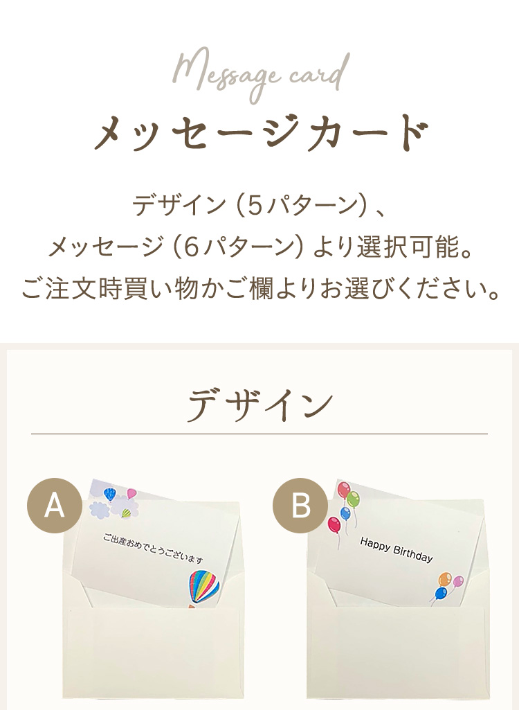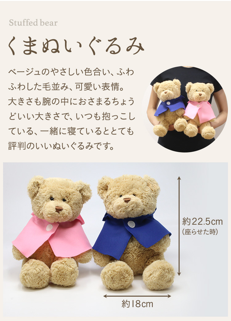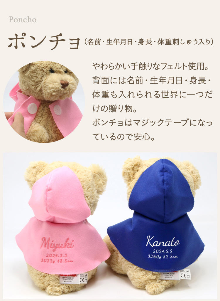 | 出産のお祝いを何にしようか悩んでいるあなたに。 「かわいい」、「ママ、赤ちゃんにも喜んでもらいたい」、「適度な大きさで飾りやすい」、という方に名前入りのポンチョを着たぬいぐるみが入った出産お祝いセットはいかがですか? 当店オリジナルのポンチョにご希望のお名前と日付を刺繍いたします。 ★こちらの商品はオーダーを受けてから、お客様専用で作成をしております。そのためご注文確定後のキャンセルや返品はお受けできません。 |