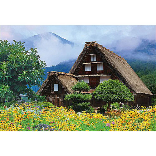 ●合掌造りの家屋に黄色い花が彩りを添え、里山の風景を一層引き立てる。(岐阜)