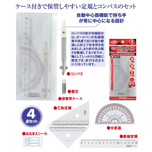 ●材質:三角定規・分度器・ケース=PVC、直線定規=R-PET樹脂、コンパス本体=亜鉛ダイカスト/ABS樹脂、替芯ケース=PP/ABS樹脂
