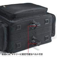 ●キャリーサポーター付きで、市販のキャリーカートへの取り付けが可能です。底面には固定ベルトも装備しています。