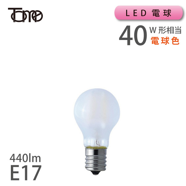 口金17サイズ。フロスト(乳白ガラス)タイプのミニLED電球です。お使いの照明器具の口金サイズとワット数を事前にお確かめくださいませ。明るさは白熱電球の40W相当の440lm。光の色味も白熱電球に近いオレンジ色系統の電球色です。