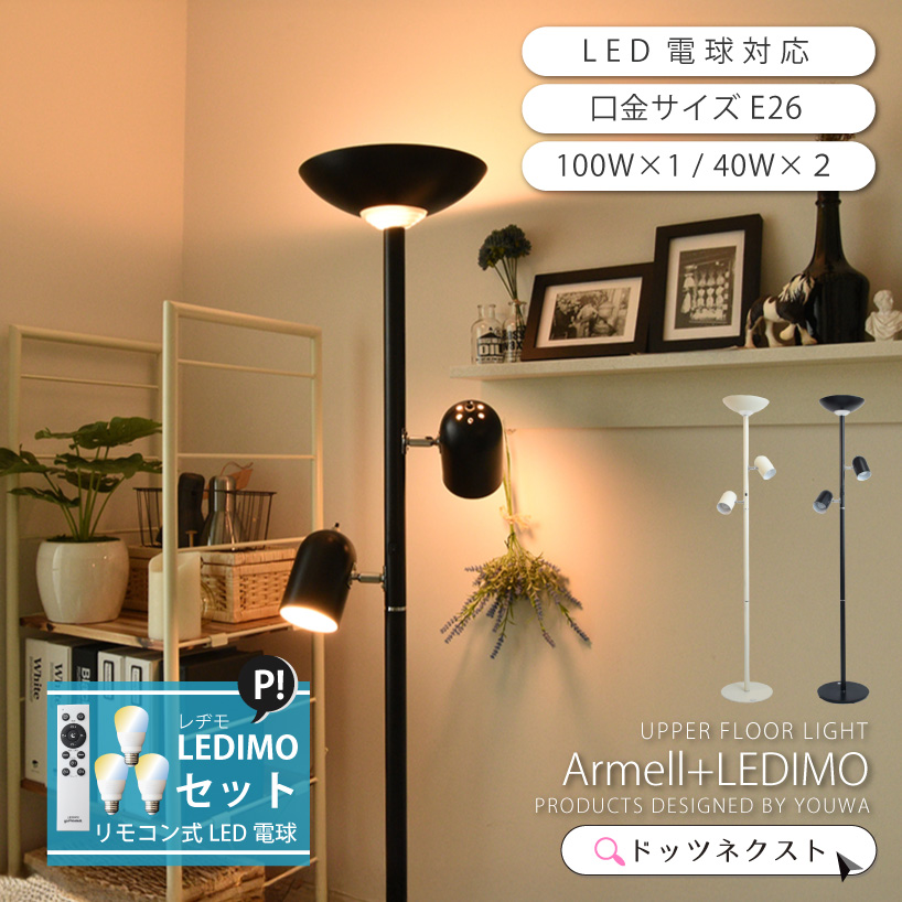 | ・商品名: ARMELL + LEDIMO set(アルメール・レヂモセット) ・商品番号:YWFL-805 / YWFL-807 ・カラー:ブラック / アイボリー ※アイボリーはクリーム色のような色合いです。 ・サイズ(mm):全高1,770 / ベース径320 / コード約2100 ※床からスポットライト(上)までの高さ:約137cm ※床からスポットライト(下)までの高さ:約116cm ・重量:約7.0kg ・素材:スチール ・付属品: LEDIMOリモコン送信機×1 / LEDIMO電球×3 ・対応電球(アッパー):口金E26/消費電力100W以下×1 ・対応電球(スポット):口金E26/消費電力40W以下×2 ※別途ご用意される方は、全長11cm未満、直径6cm未満の電球をおもとめください。 ・スイッチ:アッパーライト用ON/OFFスイッチ スポットライト用個別ON/OFFスイッチ ・取り付け:コンセント接続 ・製造国:フロアライト:ベトナム LEDIMOリモコン送信機:中国 LEDIMO電球:中国 ・保証期間:メーカー1年間保証 | ||||