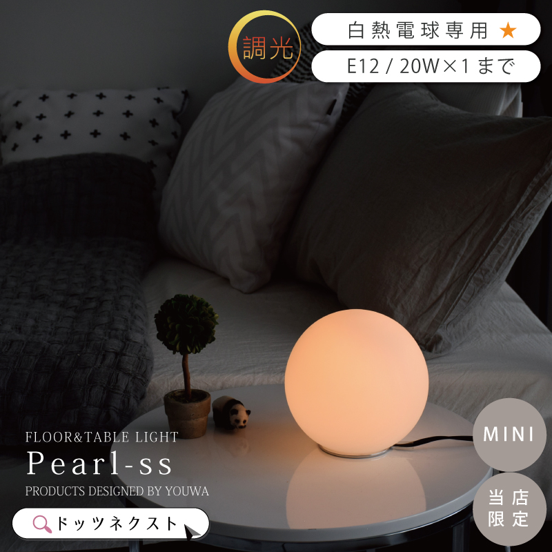 | ・商品名 :Pearl-SS-mini (パールSS-ミニ) ・商品番号:PSB337 (ON/OFF・非調光タイプ) PSB337N (明るさ調節・調光タイプ) ・サイズ(mm):径150×高150 ・重量:約0.5kg ・素材:ガラス、スチール ・付属電球:T20 ナツメ球20W E12 ・対応電球:口金E12/消費電力20Wまで×1 ※LED電球は、(ON/OFF・非調光タイプ)のみ使えます。 ・スイッチ:ON/OFF・非調光タイプ: 電源コード中間(ON/OFF) ・スイッチ:明るさ調節・調光タイプ: 電源コード中間(無段階調光) ・生産国 :台湾 ・保証期間:メーカー1年間保証 |