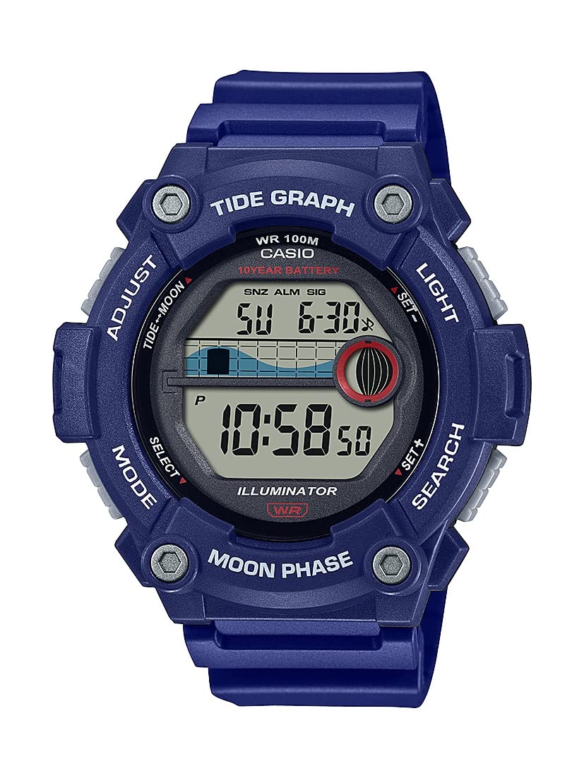 水愛好家は注目してください!マリンスポーツを始める人にとって理想的なパートナーです。 WS1300H-2AV は、耐久性のある青い樹脂の外装デザイン、100 メートルの耐水性、および 10 年のバッテリー寿命から始まります。さらに、オンボードのタイド グラフ、月のデータ、暗闇でも読みやすい LED ライトを追加して、ウォーター スポーツ愛好家が必要とするすべてをすぐに利用できるようにします。ストップウォッチ、タイマー、アラームを備えたこれらの多用途時計は、自宅やオフィスからプールや海までシームレスに移動できます。