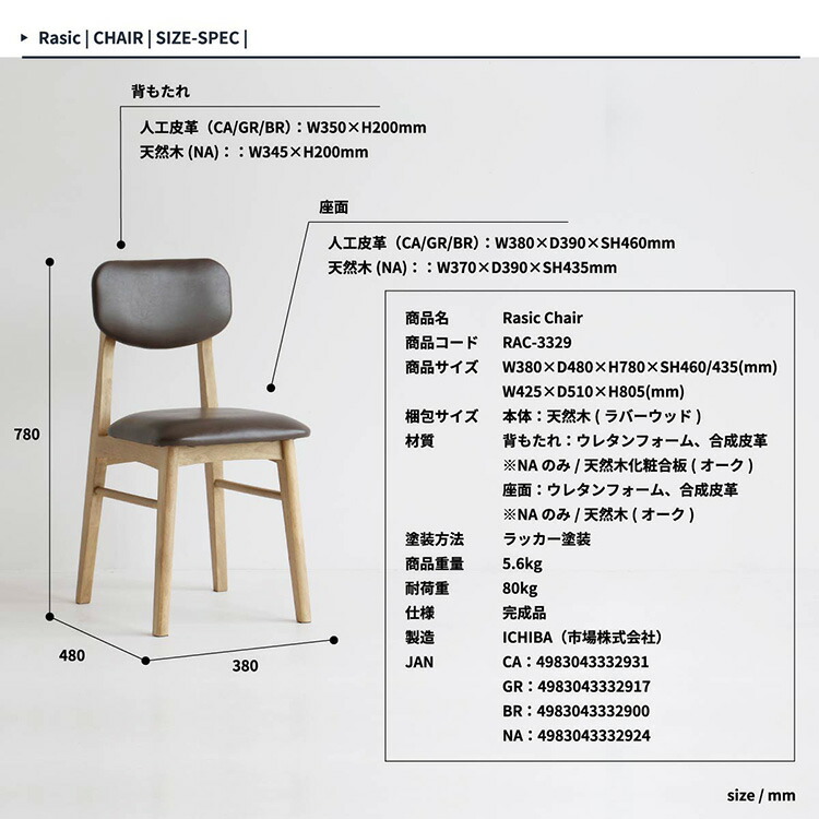 座面高:キャメル色、グリーン色、ブラウン色…46cm、ナチュラル色…43.5cm