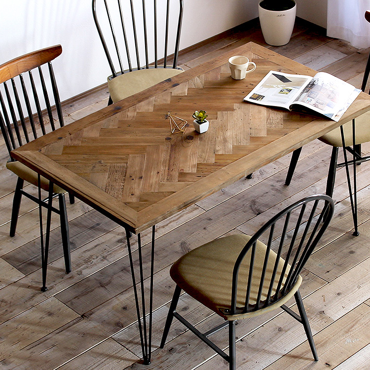 古材をヘリンボーン柄にデザインしたおしゃれなアンティーク風のダイニングテーブル。