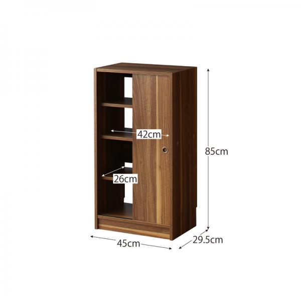 カウンター下収納 奥行30cmの薄型スリム引き戸収納。幅45cmでリビングやキッチン、一人暮らしのワンルームにも使いやすい木製収納ラックです。本棚や食器棚、キッチン収納として活躍し、木目調デザインでおしゃれに空間になじみます。引き戸仕様で省スペースでも開閉しやすく、可動棚で収納力も確保。コンパクトながら実用性が高く、すっきり整理できる使い勝手の良い一台です。