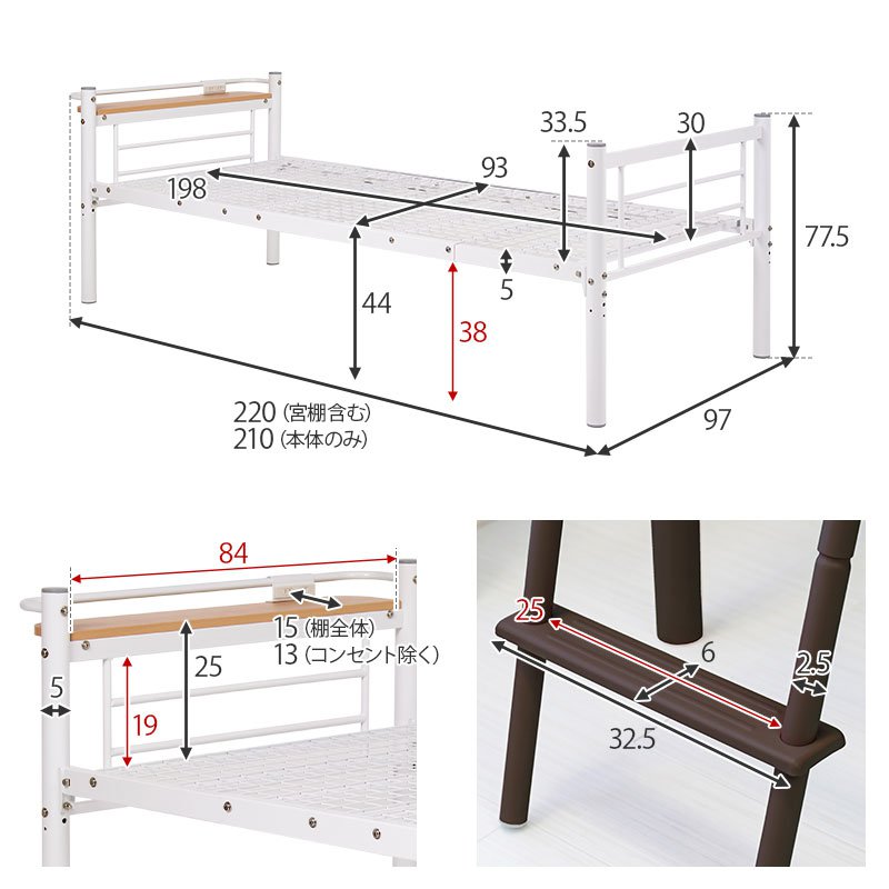 フレームのみ 耐荷重100kg ベッド下収納 白 幅97×220×184/77.5 ブラウン システムベッド 茶 棚付き ハイタイプベッド ロフトベッド ホワイト おしゃれ