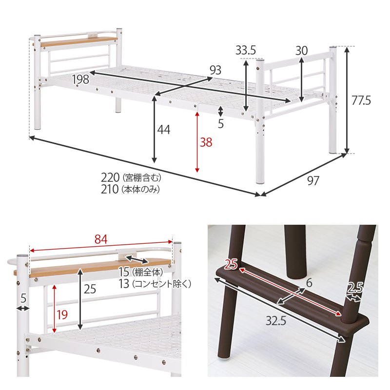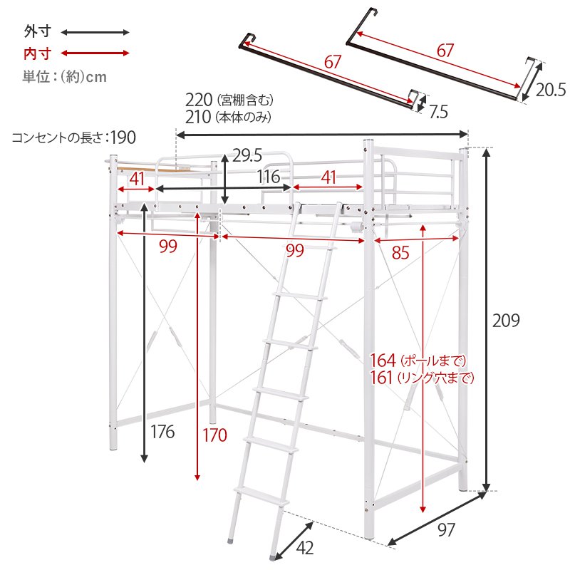 ロフトベッド ベッド下収納 フレームのみ スーパーハイタイプ 幅97×220×209/77.5 棚付き 耐荷重100kg