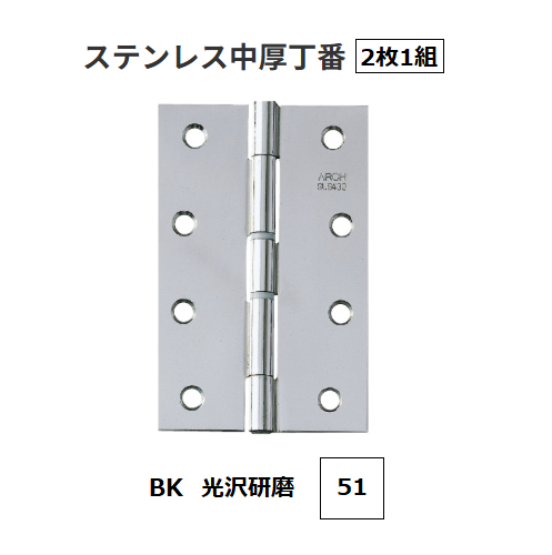 ステンレス中厚丁番ビス付 呼寸法:51 色:BK 光沢研磨 数量:2枚入り ニシムラ【代引き不可】