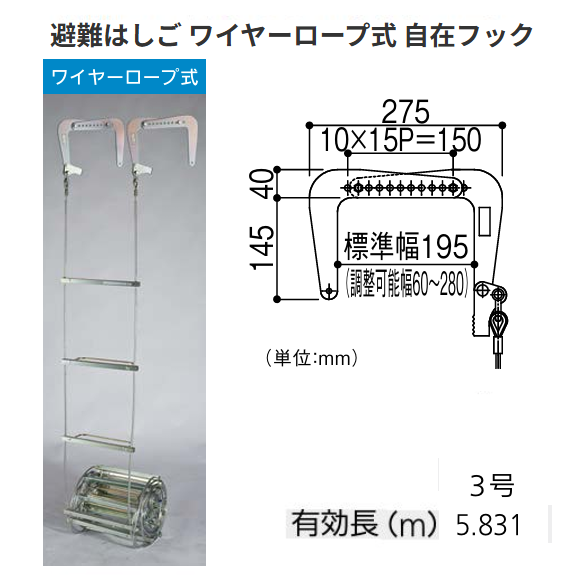 避難はしご ワイヤーロープ式 3号 有効長:5.831m 自在フック オリロー【代引き不可・個人宅配送不可】