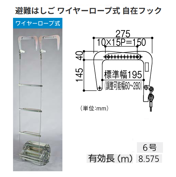 避難はしご ワイヤーロープ式 6号 有効長:8.576m 自在フック オリロー【代引き不可・個人宅配送不可】