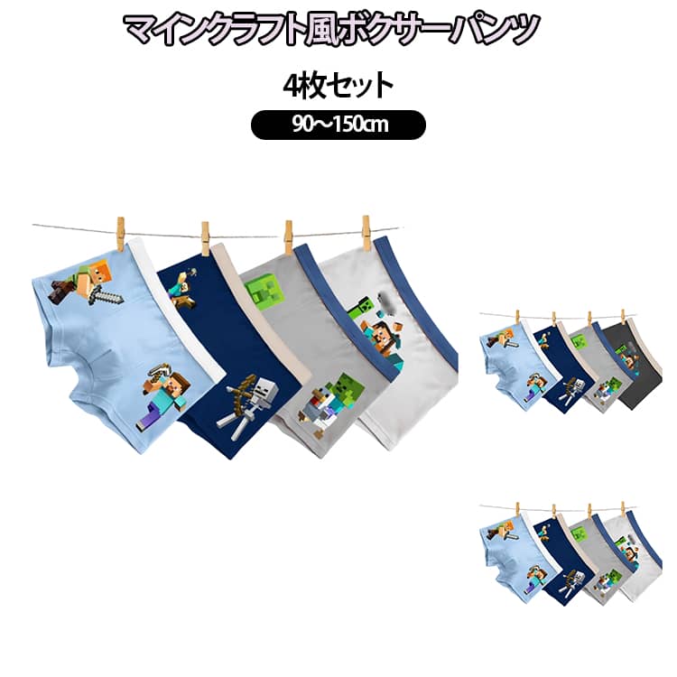 | マインクラフト風ボクサーパンツ 4枚セット 90〜150cm 綿素材 大人気ゲーム「マインクラフト」風のデザインで、お着替えタイムが楽しくなるキッズ用ボクサーパンツ。 キャラクター好きな男の子にぴったりの4枚セットです。 綿混素材を使用し、柔らかく優しい肌触り。デリケートなお子さまのお肌にも安心してお使いいただけます。 薄手でストレッチ性のある生地なので、元気に動き回るお子さまでも快適なはき心地。締め付け感が少なく、長時間の着用もラクラクです。 洗い替えに便利な4枚セットで、通園・通学用にも最適。普段使いはもちろん、プレゼントにもおすすめです。 | |